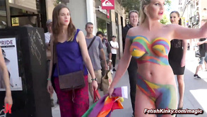 Woman enjoys in public degradation