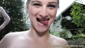 Outdoor wild ogry with 3 blonde chicks in stockings ...
