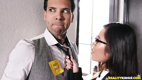Bad girl seduces a shy teacher into making sex on table